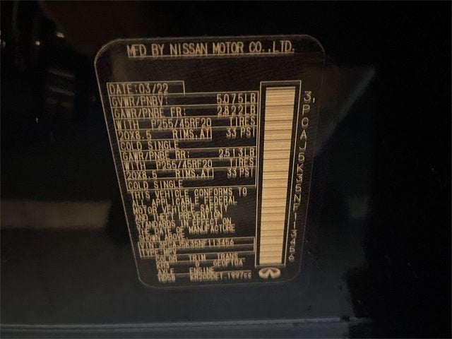 **We Deliver from our floor to your door! It's that easy! If you live within one hundred miles of our dealership, we will also deliver your car. See Dealer for delivery details. Buy Online-Get Trade Value Online-Email-Chat-Phone-Text and we will Deliver your Pre-owned vehicle to your door.** ProASSIST Package (Adaptive Front Lighting System, Blind Spot Intervention, Cube Design LED Headlights, Distance Control Assist, Intelligent Cruise Control, and Lane Departure Prevention), 16 Speakers, 4-Wheel Disc Brakes, 5.846 Axle Ratio, ABS brakes, Air Conditioning, Alloy wheels, AM/FM radio: SiriusXM, Auto High-beam Headlights, Auto tilt-away steering wheel, Auto-dimming Rear-View mirror, Automatic temperature control, Black Splash Guards (Set of 4), Blind Spot Warning, Brake assist, Bumpers: body-color, Carpeted Floor Mats, CD player, Climate Controlled Front Bucket Seats, Delay-off headlights, Driver door bin, Driver vanity mirror, Dual front impact airbags, Dual front side impact airbags, Electronic Stability Control, Emergency communication system: INFINITI InTouch, Four wheel independent suspension, Front anti-roll bar, Front Bucket Seats, Front Center Armrest, Front dual zone A/C, Front fog lights, Front reading lights, Fully automatic headlights, Garage door transmitter: HomeLink, Heated door mirrors, Heated front seats, Heated steering wheel, Illuminated entry, Illuminated Kick Plates, Knee airbag, Leather Shift Knob, Leather-Appointed Seat Trim, Low tire pressure warning, Memory seat, Navigation system: INFINITI InTouch Navigation, Occupant sensing airbag, Outside temperature display, Overhead airbag, Overhead console, Panic alarm, Passenger door bin, Passenger vanity mirror, Power door mirrors, Power driver seat, Power Liftgate, Power moonroof, Power passenger seat, Power steering, Power windows, Radio data system, Radio: Bose Performance Series Premium Audio, Rain sensing wipers, Rear anti-roll bar, Rear reading lights, Rear seat center armrest, Rear window defroster, Rear window wiper, Remote keyless entry, Security system, Speed control, Speed-sensing steering, Speed-Sensitive Wipers, Split folding rear seat, Spoiler, Steering wheel memory, Steering wheel mounted audio controls, Tachometer, Telescoping steering wheel, Tilt steering wheel, Traction control, Trip computer, Turn signal indicator mirrors, Variably intermittent wipers, Ventilated front seats, Welcome Lighting, and Wheels: 20 x 8.5 Machine Finish Aluminum Alloy.